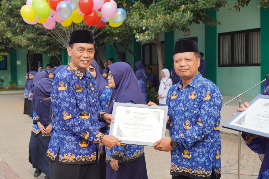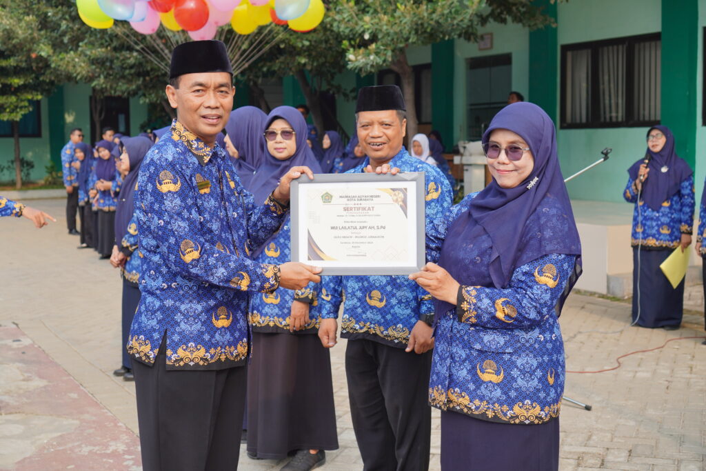 Pada acara peringatan Hari Guru Nasional 24 ini, MAN Kota Surabaya bersama pemimpinnya memberikan apresiasi kepada guru-guru yang memiliki kreativitas dan kontribusi positif terhadap madrasah. Penghargaan pertama diberikab kepada Ibu Wiji Laelatul Jum’ah sebagai guru kreatif yang memprakarsai jurnalistik. Beliau aktif mempublikasikan banyak hal seputar MAN Kota Surabaya. Melalui tulisan-tulisannya di media online MAN Kota Surabaya, lalu di teruskan ke bebarapa media online dinas hingga sosial media lainnya. Media komunikasi dan informasi publik yang dikelola oleh tim jurnalistik ini secara kontinyu menjadi sarana syiar madrasah. Tentunya, hal ini mampu membangun opini publik untuk MAN Kota Surabaya.