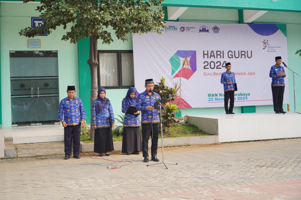 MAN Kota Surabaya merupakan salah satu lembaga pendidikan yang ikut mewarnai dinamika dunia pendidikan di Indonesia. Karenanya, lembaga ini juga turut aktif memeriahkan HGN 24 tahun. Upacara HGN di MAN Kota Surabaya diikuti oleh seluruh civitas akademik MAN Kota Surabaya, pada hari ini, Senin 25 November 2024 di halaman madrasah. Upacara dimulai pukul 07.00 wib. Semua warga madrasah berbaris memenuhi halaman madrasah. Ada 1300 orang siswa, 105 guru serta karyawan mengikuti upacara tersebut. Berbeda pada upacara sebelumnya. Pada upacara kali ini, petugas upacara adalah para guru pengajar MAN Kota Surabaya. Upacara dilaksanakan begitu tertib dan khidmat. Ada lagu hymne guru dan terima kasihku yang dinyanyikan oleh seluruh siswa dan guru.