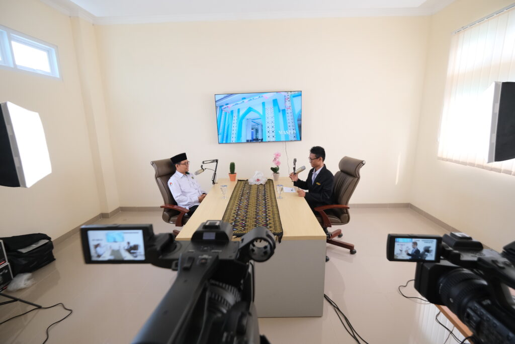 ( Bapak KH DR Ahmad Sruji Bahtiar MA bersama Raden Rangga, duta moderasi beragama tingkat Asia Tenggara saat melakukan potcast di studio potcast MAN Kota Surabaya)