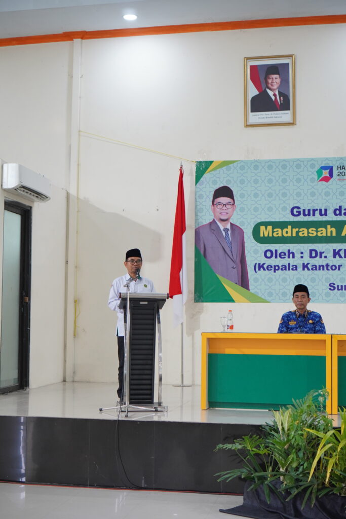 (Kepala Kantor Kementrian Agama Kota Surabaya, Bapak DR Muhammad Muslim S.Ag, M.Sy saat memberikan materi pembinaan kepada guru-guru, karyawan, perwakilan guru / pejabat MA Swasta di lingkungan Kementrian Agama Kota Surabaya)
